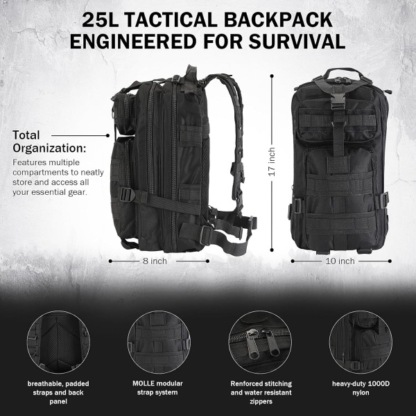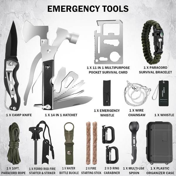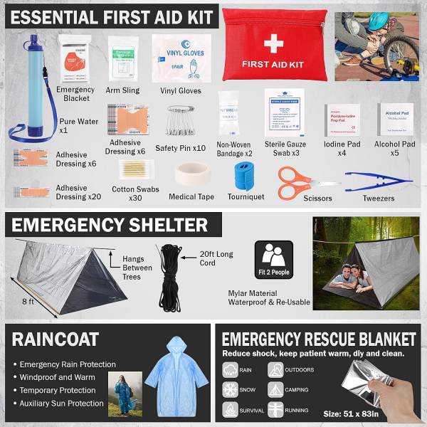 All-in-One Tactical Survival Backpack -ensiapupakkaus on suunniteltu ulkoilmaseikkailijoille, hätävalmiudelle ja katastrofivalmiuksille. Pakattuna kestävään sotilastyyliseen reppuun, se yhdistää välttämättömät selviytymisvälineet, ensiaputarvikkeet ja hätävarusteet yhdeksi täydelliseksi ratkaisuksi.