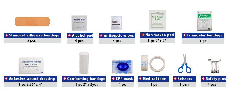 Sisältää perusensiapuvälineet pieniin vammoihin ja päivittäiseen käyttöön